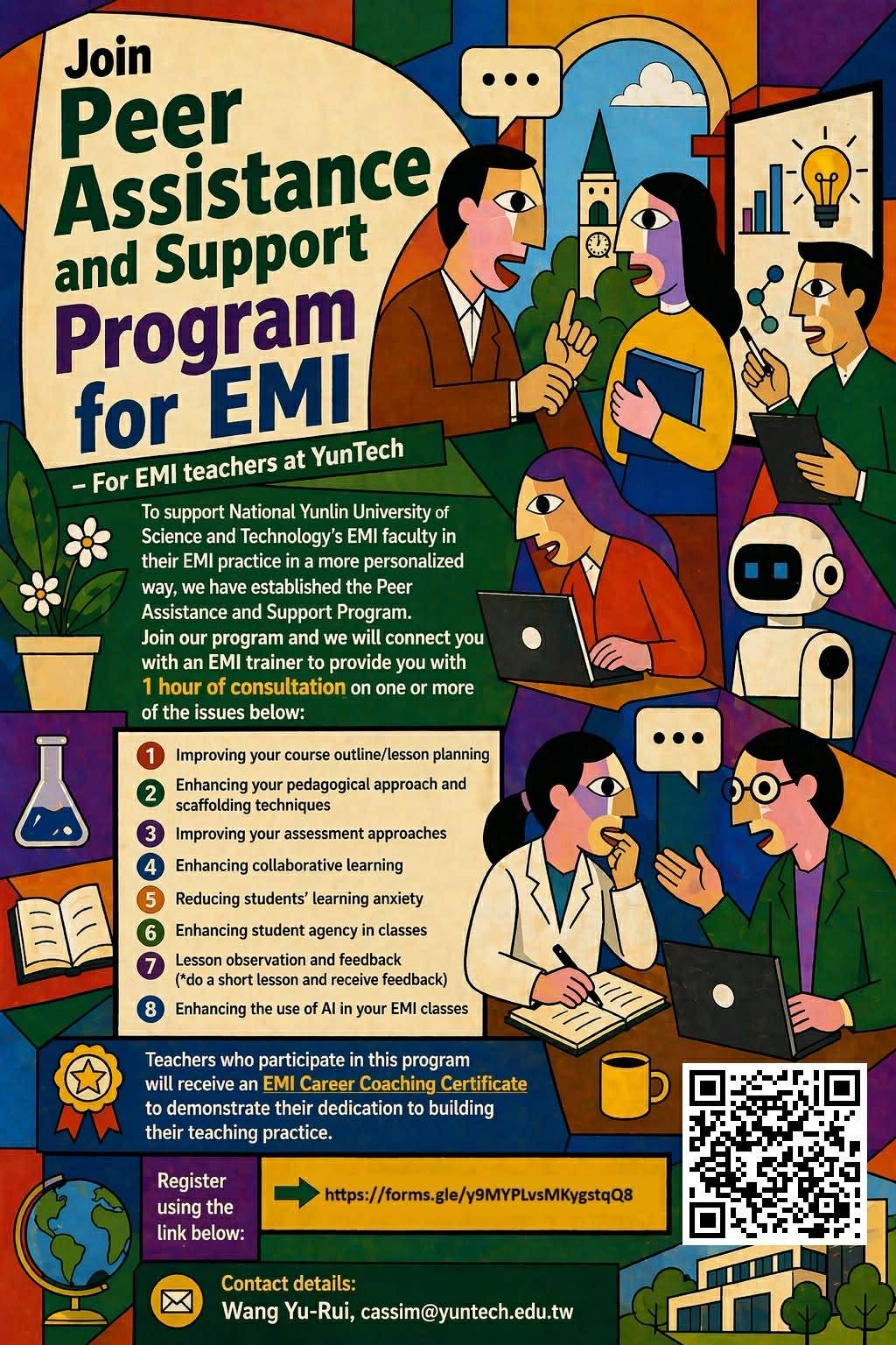 為更個別化地支持本校 EMI 教師之教學實踐,語言中心王于瑞(Joseph)老師特辦理「同儕協助與支持計畫」,歡迎教師踴躍報名參加!